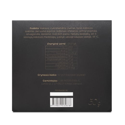 Sudedamosios dalys: kakava, cukranendrių cukrus, tyras kakavos sviestas, peruvinė pipirnė, kofeinas, imbieras, aitrioji paprika, ašvaganda, ženšenis.